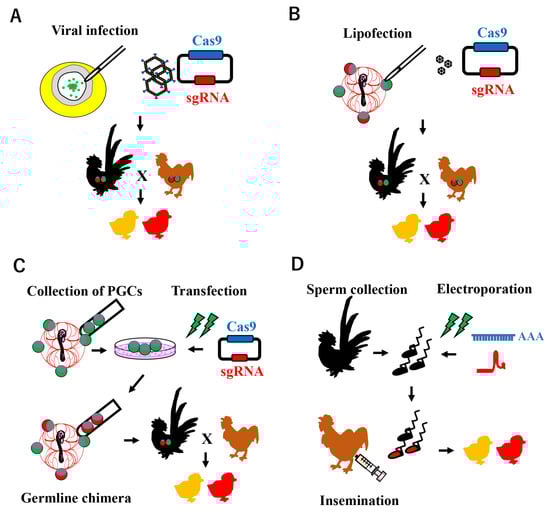 Schematic illustration of CRISPR-Cas9 system-mediated genome editing in poultry. (A) Viral infection model: a recombinant adenovirus carrying CRISPR/Cas9 components is infected at blastoderm stage X, where PGCs exist in the center area. (B) PGC-mediated genome editing: the plasmid-encoding Cas9 and sgRNA expression cassettes with lipofectamine are microinjected into embryonic blood vessels, in which the PGCs are circulating. (C) PGC-mediated genome editing: the CRISPR/Cas9 system is introduced into cultured PGCs in vitro, which are mainly collected from embryonic blood vessels. Enriched genome-edited PGCs are transferred into the blood vessels of recipient embryos to generate a germline chimera. (D) Sperm Transfection-Assisted Gene Editing (STAGE): a mixture of Cas9 mRNA and sgRNA is transfected into ejaculated sperm collected from roosters, which are then subjected to artificial insemination in hens.