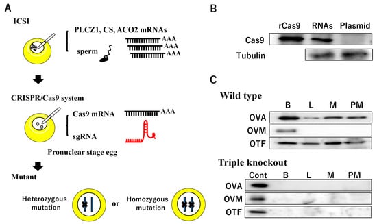 ICSI-assisted genome editing in poultry. (A) Schematic illustration of ICSI and administration of the CRISPR/Cas9 system. (B) Cas9 protein expression in a one-cell stage egg 1 h after a microinjection of a mixture of Cas9 mRNA and sgRNA or the plasmid encoding Cas9 and sgRNA expression cassettes. Cas9 protein is expressed in the egg by microinjecting RNAs prior to the pX330 plasmid injection. rCas9 is the recombinant Cas9 protein produced by the bacterial expression system. (C) Detection of ovalbumin (OVA), ovomucoid (OVM), and ovotransferrin (OTF) proteins in a D14 embryo after a microinjection of Cas9 mRNA and three sgRNAs targeting the OVA, OVM, and OTF gene loci into the one-cell stage of a quail egg. Cont, protein extract of the whole brain in a sham-operated embryo; B, whole brain extracts; L, liver extracts; M, mesonephros extracts; PM, pectoral muscle extracts.