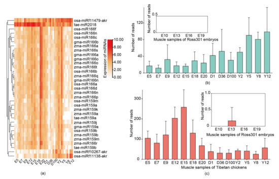 Most surprisingly, plant miRNAs such as tae-miR2018 and osa-miRf11479-akr were detected in the embryos of Tibetan chickens and showed regular expression patterns between embryo samples and post-hatch samples (Figure 2a). Among all the detected plant miRNAs, tae-miR2018 and osa-miRf11479-akr had relatively high abundance and were detected in all free-range chickens. Up to 40 copies of tae-miR2018 were found in 27 Tibetan chicken samples. Moreover, up to 40 copies of osa-miRf11479-akr were found in 19 Tibetan chicken samples, and osa-miRf11479-akr had higher read counts in the post-hatch samples than in the embryo samples. In contrast to osa-miRf11479-akr, tae-miR2018 showed the opposite distribution and had higher read counts in the embryo samples, and tae-miR2018 also showed not less than 50 reads in these post-hatch samples.