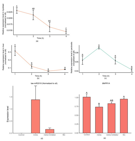 Figure 4. Expression levels of tae-miR2018. Relative expression levels of tae-miR2018 in myoblasts (a) after incubation with synthetic tae-miR2018 and in the liver (b) or pectoralis (c) of chickens at the indicated time points after gavage feeding of synthetic dietary miRNAs. One-way ANOVA with the Tukey method was used to evaluate significance (p < 0.001); ‘h’ means hour. Expression levels of tae-miR2018 (d) and BMPR1A (e) in chicken myoblasts transfected with wild type, tae-miR2018 mimic, tae-miR2018 mimic, and inhibitor ncRNA constructs.