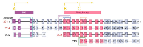 Figure 1 illustrates the isoforms captured by each primer pair. The exon 2 and exon 3 primer pair targets only isoforms containing the SH2 binding domain, which are the full-length isoforms (201 and 204) and the truncated non-protein-coding 205 isoform. The primer pairs corresponding to exon 10 and exon 12 target only full-length protein-coding isoforms that include both the SH2 binding domain and phosphatase domain (201, 204).