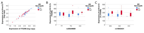 Expression of full-length INPP5D isoforms increases with high AD neuropathology, but a significant SNP effect is not detected. Full-length isoforms captured by primers targeting exons 10–12 show that INPP5D expression is increased in association with high AD pathology (A). The linear regression model was highly significant (adj R2 = 0.917), where full-length INPP5D expression correlated highly significantly with ITGAM expression (p = 2.14 × 10−29; standardized β = 0.99) and was significantly increased with high AD neuropathology (p = 0.008; std β = 0.11). Full-length INPP5D expression did not significantly correlate with either AD SNP ((B,C); p > 0.05).