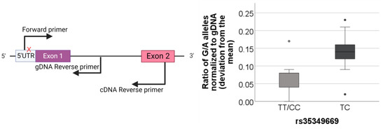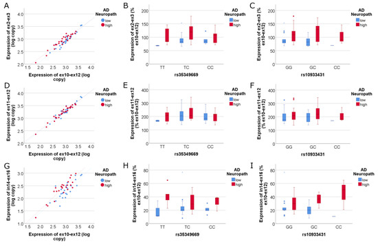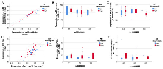 The AEI approach was previously described by Parikh et al. [34]. Here, we used rs1141328 as the AEI reporter SNP. This SNP is in the 5′ untranslated region (UTR) and is not coinherited with either AD SNP. For AEI analysis, samples were amplified for 28 cycles with primers corresponding to exon 1 and exon 2 for cDNA or exon 1 and intron 1 for genomic DNA (gDNA). The reactions used Q5 High Fidelity HotStart DNA Polymerase (NEB), and cycling conditions consisted of initial denaturation at 98 °C for 30 s, cycling at 98 °C for 10 s, annealing between 63 and 70 °C (depending on primer) for 15 s, and extension at 72 °C for 30 s, with a final extension of 72 °C for 10 min. A total of 2.5 µL of this reaction was subjected to a subsequent PCR to attach sequencing adaptors. This 25 µL reaction consisted of an initial denaturation of 98 °C for 30 s, 2 cycles of 98 °C for 10 s, between 63 and 70 °C (depending on primer) for 15 s, and extension at 72 °C for 30 s, followed by 8 cycles of 98 °C for 15 s; and 72 °C for 15 s, and a final extension of 72 °C for 10 min. PCR-amplified products were separated on a 10% polyacrylamide gel, visualized with SYBR Gold fluorescence, and the amplicons were excised, eluted [35], and purified with a Monarch PCR and DNA Cleanup kit (NEB). Exon numbering is according to the ENST00000445964.6 transcript on ENSEMBL, and primers are listed in the Tables S1 and S2. Following a Bioanalyzer QC, the PCR amplicons underwent Illumina 2 × 250 MiSeq DNA amplicon Next-Generation sequencing (UK Healthcare Genomics Core Laboratory). This process yielded a total of 13,156,256 reads, with about 3.5 million reads identified as our amplicons. Barcodes separated reads into each genomic and cDNA sample. A 16-mer sequence (GCCGGCCC[G/A]GCCGAGG), where brackets denote rs1141328 alleles, was used in an R script to count copies of each allele.