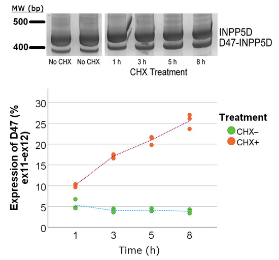 Given the introduction of a PTC in the D47 isoform, we hypothesized that the D47 mRNA might undergo nonsense-mediated decay (NMD). To test this hypothesis, we treated U937 monocytic cells with cycloheximide (CHX), a translation inhibitor that blocks NMD. Cells were treated with CHX or solvent control for 1 h, 3 h, 5 h, and 8 h in triplicate. The amount of D47 relative to total INPP5D increased with the duration of CHX treatment, supporting the hypothesis that D47 undergoes NMD (Figure 7). Hence, D47 appears to undergo NMD, and our finding here that D47 represents 13% of INPP5D expression may be an underestimate of the transcribed amounts of this isoform.