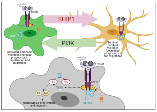 Finally, we propose an updated model for SHIP1 modulation of microglial function (Figure 9). The TREM2 signaling pathway is shown here to represent microglial ITAM signaling in general. Activation of the TREM2 receptor, subsequent receptor coupling, and association with the DAP12 complex cause a Syk-mediated signaling cascade through the PI3K pathway and the production of the secondary messengers IP3 and DAG. This downstream signaling leads to MAPK/Akt and calcium signaling that increases microglial phagocytosis, proliferation, and migration [20]. Downregulation of INPP5D has been shown to generally increase microglial association with amyloid beta plaques, increase plaque compaction, and in some cases, increase plaque engulfment and phagocytosis [5,21,22]. In this model figure, SHIP1 is depicted as a negative regulator of these PI3K-mediated processes. Hence, the increased expression of INPP5D in AD may exacerbate disease pathology by decreasing PI3K/Syk-dependent microglial functions. As such, the increased expression of INPP5D in AD may be an inappropriate compensatory response to chronic disease.