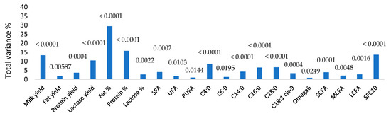 - Soyeurt, H.; Gillon, A.; Vanderick, S.; Mayeres, P.; Bertozzi, C.; Gengler, N. Estimation of heritability and genetic correlations for the major fatty acids in bovine milk. J. Dairy Sci. 2007, 90, 4435–4442. [Google Scholar] [CrossRef] [PubMed]