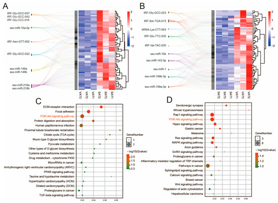 tsRNA/miRNA/mRNA co-expression network. (A,B) Mulberry leaf plot of the tsRNA/miRNA/mRNA co-expression network based on high mRNA expression in SAT (A) or VAT (B). (C,D) KEGG analysis of mRNAs highly expressed in SAT (C) or VAT (D) in co-expression networks.
