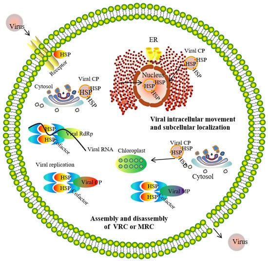 The viral macromolecular complexes (MCs) consist of virus-encoded proteins, host-derived proteins, the viral RNA template, nucleotides, etc. These components are assembled into, for example, the virus replication complex (VRC) on intracellular membranes to conduct some functions important to virus maintenance and replication [43,44]. So far, MCs have been isolated from human, animal, and insect viruses, and shown to contain many molecular chaperones for the corresponding host (Table 1). As cellular chaperones, HSPs function with respect to viral multiplication, replication, movement, assembly, disassembly, infection, uncoating, and virion morphogenesis in human, animal, and plant hosts (Figure 3).