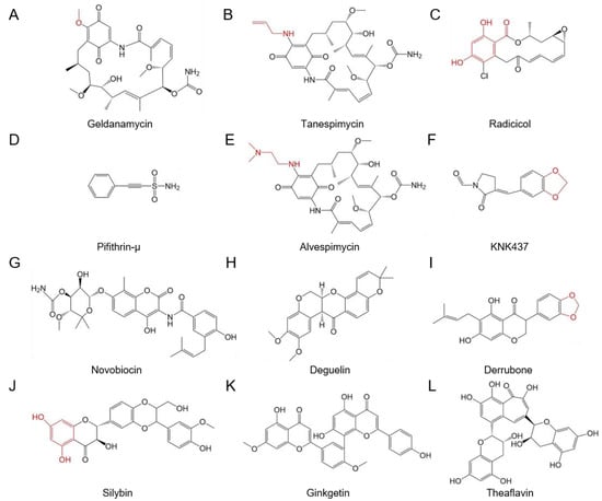 The derivatives of benzo[d]thiazole and 4,5,6,7-tetrahydrobenzo[d]thiazole displayed antiviral activity against influenza A (H1N1, H3N2) and influenza B viruses, and showed higher binding affinities for HSP90 [209]. Deguelin (Figure 4H), a naturally occurring rotenoid, can downregulate clients of HSP90 (Cdk4, Akt, eNOS, and MEK1/2) [210]. Deguelin bound to ATP and did not affect the ATP pocket in HSP90N [211]. These results indicated that deguelin might bind to the ATP pocket in HSP90C. Derrubone (Figure 4I) and silybin (Figure 4J) can target Hsp90C and then possess antitumor activity [212,213]. Virtual screening indicated that ginkgetin (Figure 4K) and theaflavin (Figure 4L) developed favorable, as well as crucial, interactions with the HSP90 ligand-binding pocket. Molecular dynamics simulations of these two natural molecules exhibited minimal fluctuations in the binding pattern of ginkgetin and theaflavin to HSP90, which retained crucial contacts throughout the simulation time. Ginkgetin and theaflavin were known as potent HSP90 inhibitors [214].
