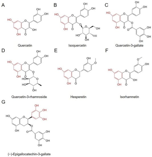 The molecular structure of quercetin and its analogs as HSP inhibitors. (A) Quercetin. (B) Isoquercetin. (C) Quercetin-3-gallate. (D) Quercetin-3-rhamnoside. (E) Hesperetin. (F) Isorhamnetin. (G) (−)-Epigallocatechin-3-gallate.