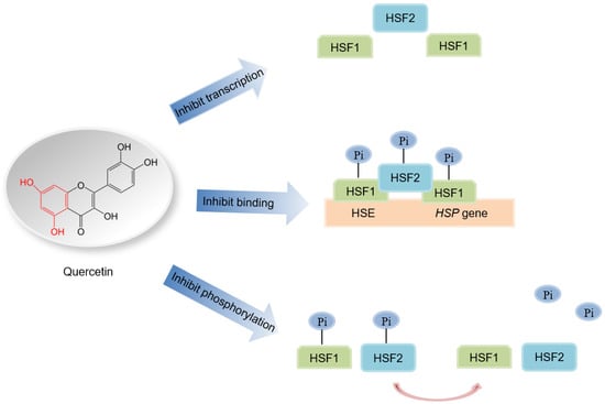 Data from HeLa cells indicated that heat shock increased the concentration of a phosphorylated form of HSF1, and that quercetin could significantly decrease the amount of the phosphorylated form of HSF1 following heat shock treatment, or in the untreated control. Meanwhile, treatment with quercetin did not change the amount of the unphosphorylated form of HSF1, regardless of treatment conditions [34]. In addition, another study indicated that the condition factors of elevated temperature, low pH, urea, detergents, or Ca2+ can activate HSF levels in cytoplasmic extracts of HeLa cells untreated with heat shock [32,196]. However, the HSF activated by heat shock is inhibited by adding quercetin [197]. Meanwhile, the activated HSFs from cytoplasmic extracts following exposure of the cells to heat shock can bind HSEs during the binding reaction of added quercetin. The above results indicated that quercetin can inhibit the status of the activated HSF, but did not influence the binding mode between HSF and HSE (Figure 6) [197].