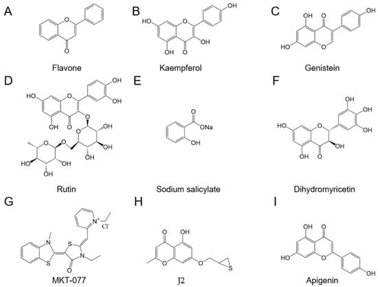 The molecular structure of flavonoids or other HSP inhibitors with the activity of HSP inhibition. (A) Flavone. (B) Kaempferol. (C) Genistein. (D) Rutin. (E) Sodium salicylate. (F) Dihydromyricetin. (G) Rhodacyanine-based (MKT-077). (H) Chromone analogs possessing thiiran-2-ylmethoxy or oxyran-2-ylmethoxy substituents. (I) Apigenin.