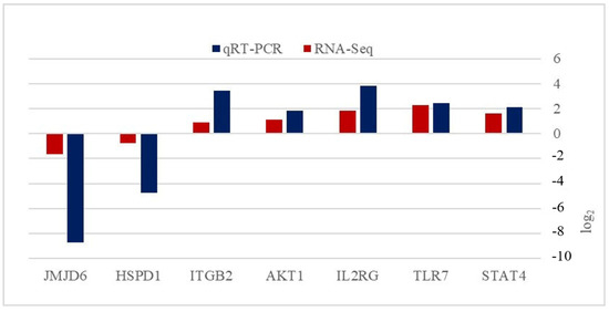 To technically validate the RNA-Seq results, seven differentially expressed genes (five upregulated genes from the innate immune system and two random downregulated genes) were selected for real-time PCR analysis. The correlation between the mRNA expression levels from real-time PCR and RNA-Seq was relatively high, and the expressions of genes were correlated with the transcriptome data, indicating the reliability of the data (Figure 3).
