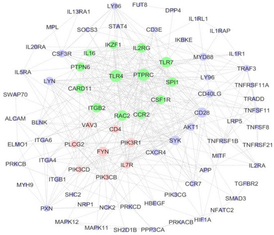 PPI network of immune-system-related upregulated DEGs. The size of each node is based on degree value; a bigger size is related to a larger degree value. The color of each node is related to one of two subnetwork modules that were obtained (green and pink).