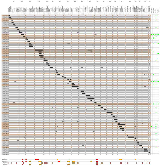 Position of QTLs related to BNF in the genetic map of peanuts. Each column indicates a linkage group named from A01 to A10 (A genome) and B01 to B11 (B genome). Each row indicates a CSSL. The white background represents the genetic background of the recurrent parent Fleur11. The black areas represent the wild target chromosome segments, while the grey areas represent the wild supernumerary chromosome segments. CSSLs showing significant differences compared to Fleur11 are highlighted in orange. The green circles on the left of the figure represent the relative effect on the QTL. Their sizes are proportional to the QTL’s relative effect. SPAD and TB correspond to the leaf chlorophyll content and the total biomass, respectively, evaluated in 2017 and 2018. All the QTLs identified had a negative effect on the measured traits. QTL locations are indicated by rectangles located at the bottom of the figure. Red = QTL with known location, orange = putative QTL.