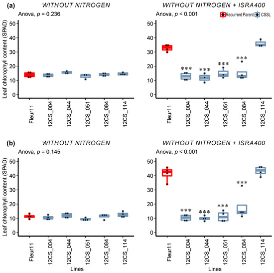 Differences in the plant growth between Fleur11 and the CSSLs were observed thirty-five days post-inoculation. For the leaf chlorophyll content, no difference was found between Fleur11 and the CSSLs under the −N treatment, while in the inoculated treatment, we observed a significant decrease in the chlorophyll content (~53–75%) for the lines 12CS_004, 12CS_044, 12CS_051, and 12CS_084 in the first and second experiments (Figure 2).