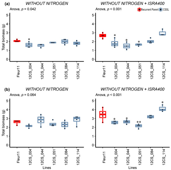 Regarding the total biomass, except for line 12CS_004 in the first experiment, no difference was found between Fleur11 and the CSSLs under the −N treatment (Figure 3). In the inoculated treatment, we found that 12CS_114 produced more biomass compared to Fleur11, but this difference was statistically significant in only one experiment. Three lines (12CS_004, 12CS_044, and 12CS_051) exhibited a significantly lower biomass (23–43%) than Fleur11 in both experiments (Figure 3). Although the biomass decrease was less pronounced under controlled conditions, these results globally confirmed the observations made under the shade house, providing additional evidence that the corresponding QTLs are possibly involved in the symbiotic interaction with B. vignae ISRA400.