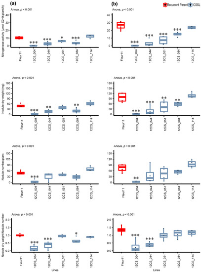 Significant line × trait of nodulation traits 35 days after inoculation between 5 CSSLs and the recurrent parent Fleur11. (a,b): First and second experiments, respectively. *, **, and *** indicate values significant at p < 0.05, p < 0.01, and p < 0.001, respectively, using Dunnett’s multiple comparisons test.