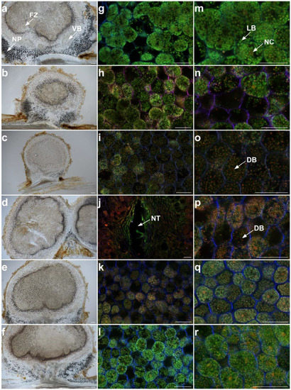 Longitudinal sections of the nodules of 5 CSSLs and the recurrent parent Fleur11 35 days after inoculation with B. vignae ISRA400. Differential interference contrast microscopic images (a–f) showing nodule structure and confocal microscopic images (g–r) showing live (green) bacteria, dead (red) bacteria, and plant cell walls (blue). Nodule sections of Fleur11 (a,g,m); line 12CS_004 (b,h,n); line 12CS_044 (c,i,o); line 12CS_051 (d,j,p); line 12CS_084 (e,k,q); and line 12CS_114 (f,l,r). FZ: fixation zone; NP: nodule parenchyma or inner cortex; VB: vascular bundles; NC: nucleus; NT: collapsed necrotic tissue; LB: live bacteroids; DB: dead bacteroids. Scale bar = 50 µm.