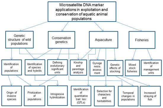 Microsatellites are highly polymorphic, neutral and co-dominant DNA markers based on a variable numbers of short, usually 2–4 bp, nucleotide repeats [172]. Microsatellites have been most widely applied in research related to populations, fisheries and aquaculture beginning in the early 1990s [173,174,175,176]. The next generation sequencing (NGS) genome assay enables the identification of many thousands of microsatellites of which a dozen or so highly polymorphic loci are usually sufficient for population genetic and aquaculture applications, e.g., in [177]. This review is an attempt to summarize the applications of microsatellite DNA markers to studies of natural populations, aquaculture stocks, fisheries and conservation genetics of aquatic animals (Figure 1).