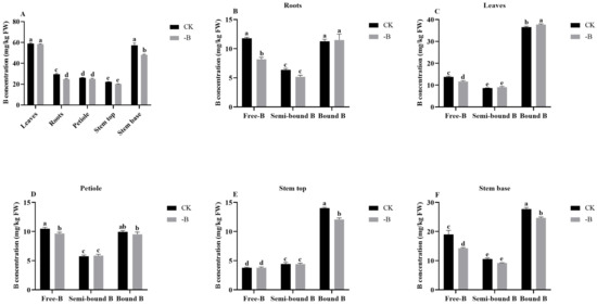 After 24 h B deficiency treatment, the concentration of total B in roots and stem base were significantly decreased, whereas the leaves, petiole and stem top showed no remarkable differences (Figure 1A). In detail, the free B concentration in roots, leaves, petiole and stem base were significantly decreased, whereas there were no remarkable differences in the stem top (Figure 1B–E). Moreover, the bound B concentration significantly increased in leaves and decreased in stem top and stem base, respectively (Figure 1C,E,F). Semi-bound B concentration had no significant differences in all plant parts (Figure 1).