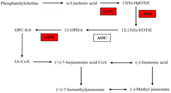 Differentially expressed genes involved in JA synthesis. Red refers to the significantly up-regulated genes. LOX (lipoxygenase); AOS (allene oxide synthase); AOC (allene oxide cyclase); OPR (12−oxophytodienoic acid reductase).