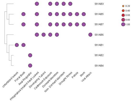 | StYAB7 | Abaxial cell fate commitment | Leaf development | Nucleus | Floral buds, cadmium stress, dormant and non-dormant potato tubers, photoperiod effect, phloem associated cells | YABBY2 | Putative axial regulator | [48,50] |