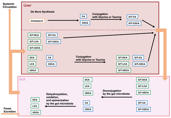 Bile acids (BAs) are important amphiphilic steroidal molecules generated from cholesterol in the liver and are important components of bile. BAs that are produced by de novo synthesis in the liver are called primary BAs. BAs move from the liver to the gallbladder and are secreted from the gallbladder into the small intestine in response to food intake. Because BAs are amphiphilic, they can function as surfactants to form micelles with cholesterol, lipids, and lipophilic vitamins in the intestine, facilitating the digestion and absorption of these fat-soluble substances [1,2]. Most of the BAs that are involved in facilitating fat digestion and absorption are absorbed before passing through the ileum [3]. However, some BAs that are not taken up by the intestine are transferred to the colon. During their transit to the colon, BAs undergo various modifications by the gut microbiota and microbiota-modified bile acids are called secondary BAs [4]. Because BAs are modified in a variety of ways by different types of bacteria present in the gut microbiota, changes in the gut microbiota can affect the metabolism of BAs in the host [5,6]. Some of the modified BAs are then absorbed. The absorbed BAs in the gut are then transported to the liver via the portal vein. This circulation of BAs between the liver and the intestine is called enterohepatic circulation. However, the BAs that are not absorbed in the gut are ultimately egested in the feces. Therefore, BAs play a role in the excretion of cholesterol. Furthermore, although most BAs absorbed from the gut are transferred to the liver, some are transferred to the systemic circulation [6,7] (Figure 1).
