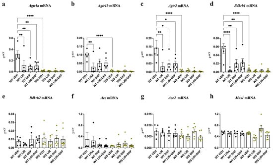 First, hippocampal levels of Agtr1a, Agtr1b, Agtr2 and Bdkrb1 were significantly downregulated in vehicle-treated WS rats relative to their vehicle-treated WT littermates (Figure 1a–d) (p < 0.0001). These alterations were conserved in WS rats across all treatment groups, indicating that none of the administered drugs (LIR only, 7,8-DHF only or combination) were able to modulate this downregulation. In contrast, a treatment-induced effect was evident in WT animals; Agtr1a, Agtr1b, Agtr2 and Bdkrb1 were significantly downregulated across all treatment groups relative to the vehicle group (Figure 1a–d) (p < 0.05). Finally, no significant treatment- or genotype-driven differences were observed for Bdkrb2, Ace, Ace2 and Mas1 expression (Figure 1e–h).