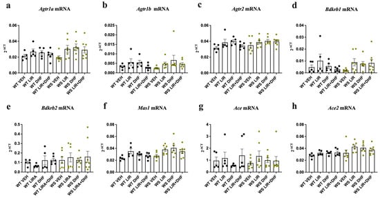 qPCR was performed on the QuantStudio 12K Flex Real-Time PCR System (Applied Biosystem, Waltham, MA, USA) using Taqman Gene Expression Mastermix (Thermo Fisher Scientific, Baltics, Vilnius, Lithuania) with the following TaqMan Gene Expression Assays: Ace (angiotensin I converting enzyme; Rn00561094_m1), Ace2 (angiotensin I converting enzyme 2; Rn01416293_m1), Agtr1a (angiotensin II receptor, type 1a; Rn02758772_s1), Agtr1b (angiotensin II receptor, type 1b; Rn02132799_s1), Agtr2 (angiotensin II receptor, type 2; Rn00560677_s1), Bdkrb1 (bradykinin receptor B1; Rn02064589_s1), Bdkrb2 (bradykinin receptor B2; Rn01430057_m1) and Mas1 (MAS1 proto-oncogene G protein-coupled receptor; Rn00562673_s1). The expression of target genes was normalized to Hprt1 (hypoxanthine-guanine phosphoribosyltransferase; Rn01527840_m1) as an endogenous reference control. Relative expression was quantified using the 2−ΔCt method [].