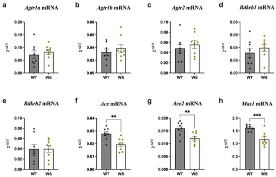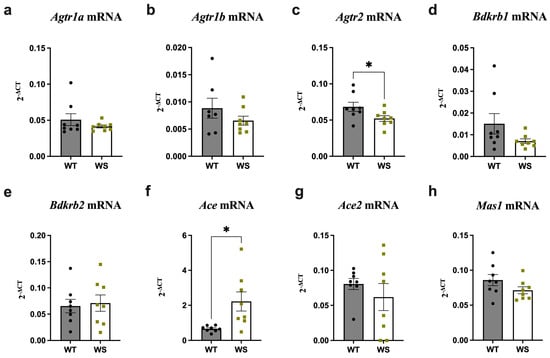 Indeed, increased Ace and decreased Agtr2 expression was seen in the brain stems of treatment-naïve WS relative to WT rats (Figure 4g,c) (p < 0.05). Additionally, a slight, albeit insignificant, downregulation, was observed for Agtr1a, Agtr1b and Bdkrb1 expression in WS animals (Figure 4a,b,d). Finally, and as observed in the hippocampus, Mas1 and Ace2 expression was also slightly—although not significantly—decreased in WS rats (Figure 4f,h).