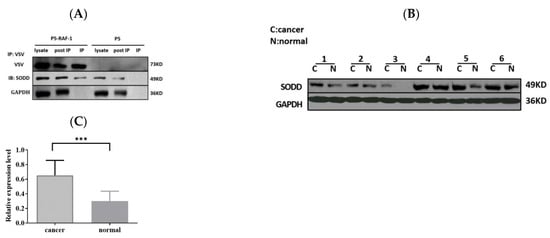 SODD is confirmed as an RAF-1-associated protein and overexpressed in lung cancer tissues. (A) VSV-tagged RAF-1 was inserted into the pcDNA5 plasmid (P5) in HEK 293T cells, and VSV beads were used to catch RAF-1-binding proteins. The WB outcome confirms that SODD binds to RAF-1. (B,C) SODD expression in lung cancer tissues was analyzed by WB. The expression of GAPDH was detected to ensure the samples’ loading amount. The SODD expression significantly increased in cancer tissues, as compared with adjacent normal tissues. (*** p < 0.001).