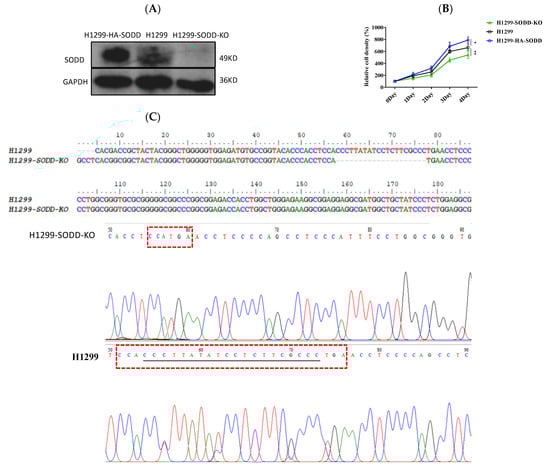 Establishing a SODD knockout (KO) and overexpressed (HA-SODD) H1299 cell line and exploring the effect of SODD on H1299 cell growth. (A) SODD expression in SODD (KO), HA-SODD, and H1299 cells was detected by Western blotting (B) SODD promotes the proliferation of H1299 cells. The overexpression of SODD could promote the growth of H1299 cells, whereas the knockout of H1299 could inhibit it. (* p < 0.05, ** p < 0.01 vs. control) (C) The DNA sequencing of SODD-KO (SODD−/−) and WT H1299 cells served to confirm SODD knockout. The missing bases are underlined in the red box.