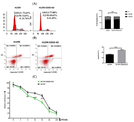 SODD knockout promotes apoptosis and cell cycle arrest in H1299 cells, reduces its ability, and enhances the sensitivity of H1299 cells to cisplatin. (A) The distribution of cells in G1/G0, G2/M, and S phases was measured through flow cytometry. (B) The percentage of apoptotic SODD-KO H1299 and H1299 cells. (C) SODD-KO H1299 and H1299 cells were incubated with increasing concentrations of cisplatin and counted through CCK-8. (** p < 0.01, *** p < 0.001 vs. control).