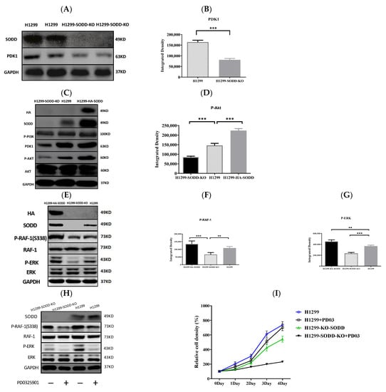 Effect of SODD expression on PDK1/AKT and RAF-1/ERK cascades. (A,B) PDK1 expression in the SODD-KO and WT H1299 cells was detected by WB. (C) WB shows the effect of SODD knockout on the PDK1/AKT signals in response to EGF. (D) Phospho-AKT (S308) in H1299-HA-SODD, SODD-KO, and WT H1299 cells. (E) WB shows the phosphorylation level of RAF-1 and ERK in SODD-KO, HA-SODD, and WT H1299 cells. (F,G) Phospho-RAF-1 and ERK in H1299-HA-SODD,SODD-KO, and WT H1299 cells. (H,I) WB shows the total and phosphorylated RAF and ERK in SODD-KO and WT H1299 cells treated with PD0325901 and the correspondent cell growth curve (H) (** p < 0.01,*** p < 0.001 versus control).