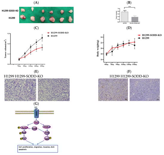 SODD knockout inhibits H1299 cell tumorigenicity in a nude mouse xenograft model (A) Two groups of excised tumors from nude mice injected with SODD-KO H1299 and H1299 cells. (B) The statistical difference in the tumor masses from the two groups (*** p < 0.001). (C,D) The difference in the tumor volume and body weight between two groups of mice (E) Hematoxylin and eosin (HE) staining of tumors from the two groups. (F) PDK1 staining of tumors from the two groups. (G) The indicated roles of SODD in the RAF-1/MEK/Erk and PI3K/PDK1/AKT pathways.