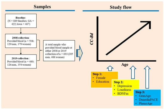 The general flow of the study is depicted graphically in Figure 1. Our statistical approach involved using growth models with time-varying covariates to test the hypotheses regarding the substantive effects of depression, loneliness, and BDNFm on CC-Bd. Age, centered at 30, was the measure of time in growth curve models that incorporated random effects of initial levels and linear growth rates while using individually varying observation times. All analyses were performed with Stata version 17. Missing data were handled by mixed effects models under missing at random using maximum likelihood methods [70]; this method assumes that missing data are randomly distributed and are unrelated to the dependent variable [71]. This assumption is met in the FACHS sample, as missing data are derived from the random attrition associated with a longitudinal design [72]. To correct the non-independence of the couple effects, we also included random effects for couple relationship. To simplify the models, if the variation associated with couple effects was not significant, we then dropped this random effect when we ran the conditional growth models.