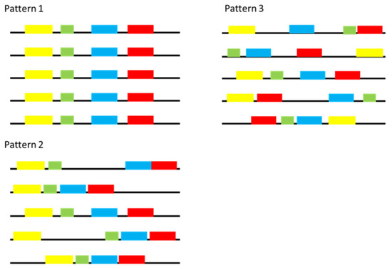 A diagrammatic illustration of the three different distribution patterns of the motifs across the different genes. Each black line represents a 1000 bp sequence upstream of the start codon for a gene, while coloured blocks represent different motifs present in this region. In Pattern 1, there is clear conservation in the spatial position and order of the motifs across the different genes. In Pattern 2, there was conservation in the order of the motifs only but conservation in the spatial position was lacking. There was no observed conservation in either motif order, or motif positioning in those motifs grouped in Pattern 3. This figure was modelled after the distribution patterns observed in this study, with full patterns provided in Figure S2.