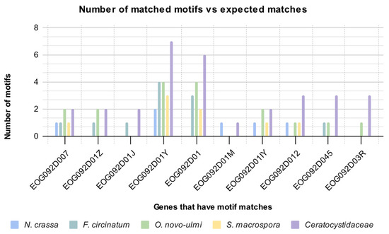 The 17 genes from which motifs were identified in the Ceratocystidaceae genomes were also successfully annotated in the genomes of O. novo-ulmi, F. circinatum, S. macrospora and N. crassa. Of the 17 genes investigated, MAST searches identified motifs corresponding to those discovered from the Ceratocystidaceae genomes in the 1000 bp upstream region of only 10 genes (Table 6). These included 17 motifs in the O. novo-ulmi genome, 11 motifs in the F. circinatum genome, 8 motifs in the S. macrospora genome and 6 motifs in the N. crassa genome (Figure 3). Despite F. graminearum being most closely related to Figure 4, most matches to the Ceratocystidaceae motifs were identified in O. novo-ulmi. The low number of hits per genes precluded the investigation for similarities in the distribution pattern of the motifs.
