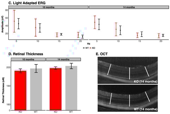 - Krishna, V.R.; Alexander, K.R.; Peachey, N.S. Temporal properties of the mouse cone electroretinogram. J. Neurophysiol. 2002, 87, 42–48. [Google Scholar] [CrossRef]