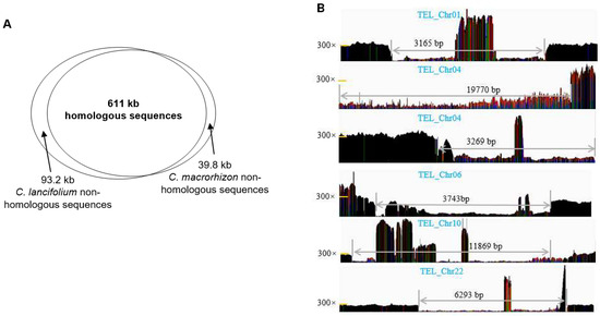 The maintenance and turnover of homologous sequences in the C. lancifolium and C. macrorhizon mitogenomes. (A) The relative composition of homologous and non-homologous sequences in the two mitogenomes. (B) Validation of C. lancifolium non-homologous sequences by using C. macrorhizon short reads. The gray arrows highlight the six largest indels caused by the maintenance of C. lancifolium-specific sequences.