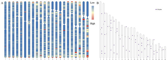 Distribution of target microhaplotypes (MHs). (A) Distribution of MHs within 80 bp consisting of 2 or more single nucleotide polymorphisms (SNPs) in the Chinese Southern Han (CHS) and effective number of alleles (Ae) values ≥ 3. The “low” and “high” represent the distribution densities of the target MHs. (B) Physical locations of the final 50 MHs.