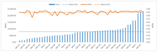 Fifty MHs of all 137 unrelated Southwest Chinese Han individuals in this study were consistently captured and sequenced to obtain complete MH alleles. These samples were genotyped at 1.825–25.992 ng of input DNA using the DoCs and ACRs of all 50 MHs to assess the panel sequencing performance. The average DoC was 7928.39 ± 4990.952× (Figure 4). The average ACR was 0.90 ± 0.045, and 96% of the MHs (48/50) exhibited a proportion of allele balance ≥ 80% (Figure 4), indicating the panel had a good balance in detecting heterozygotes (i.e., good heterozygosity balance). No correlation was found between the DoCs and ACRs (linear correlation coefficient R2 = 0.0771).