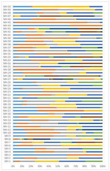 Allele frequencies of 50 MHs based on sequenced 137 Southwest Chinese Han unrelated individuals. Different colors of the bars represent different haplotypes (alleles), and the length of each bar represents the frequency of each allele.