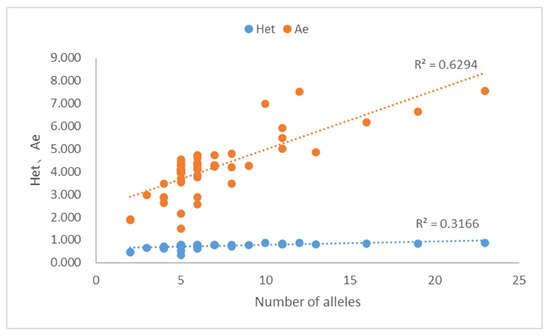 Scatter plot of 50 MHs for the number of alleles, heterozygosity (Het) and Ae. Relationship among the number of alleles, Het, and Ae values.