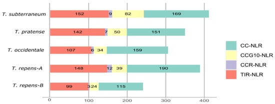 Here, we utilized the NLR tracker pipeline [16] for NLR genes mining and successive annotations. In total 412, 350, 306, 389 and 241 NLR genes were identified from T. subterraneum, T. pratense, T. occidentale, subgenome-A of T. repens and subgenome-B of T. repens, respectively (Figure 1). All four major classes of NLR gene families were present in all four species, with subclass CC-NLR exhibiting the highest contribution and CCR-NLR showing the least number of homologs, which was consistent with the previous reports [21]. Overall, an apparent correlation was not observed between the genome size and number of NLR genes. T. subterraneum has shown largest expansion of NLR gene family even though it has a genome size of 460 Mb as compared to subgenome-A of T. repens (513 Mb) and T. occidentale (484 Mb). The allotetraploid T. repens interestingly shows an expansion of the NLR gene family in subgenome-A as compared to its ancestor T. occidentale. It implies that genome expansion also favored the duplication of NLR gene family. CCR-NLR is the most conserved class of NLR genes, and its repertoire remains stable across Fabaceae members [21]; however, the subgenome-A of T. repens have shown their significant expansion. It is consistent with the previous observation that polyploidization may increase or decrease the number of certain genes families [34]. The overall pattern of NB-ARC encoding genes in all Trifolium species is CNL of 46.5% and TIR-NLR up to 38%. The repertoire of NLR sequence identified in this study is provided in the Supplementary Materials (Supplementary Table S2).