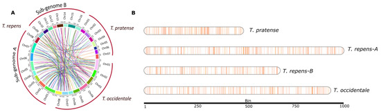 Syntenic and gene density plots of Trifolium species. (A) Synteny analysis of NLR genes between T. repens (A and B subgenomes), T. occidentale (progenitor) and T. pratense. (B) The NLR genes located on chromosomes are denoted in vertical blue and orange lines, inferring the gene density map between genomes assemblies of three Trifolium species.
