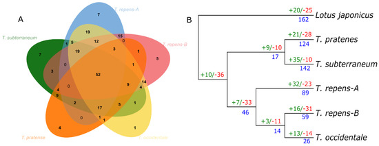 The number of gene gain and gene loss analysis. (A) The ortho Venn diagram depicts the shared NLR genes among species of Trifolium. (B) The red color code represents the gene loss, green indicates gene gain and blue denotes gene duplication.