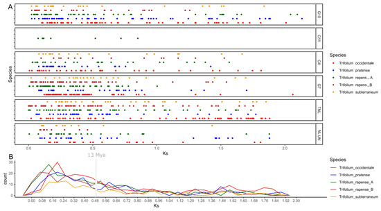 Estimation of NLRome duplication event in the genus Trifolium. All five species belonging to the genus Trifolium with Ka/Ks values of their paralogs are denoted. (A) The vertical axis indicate Ks value and horizontal axis shows frequencies. (B) The generalized observed duplication manner in all species.