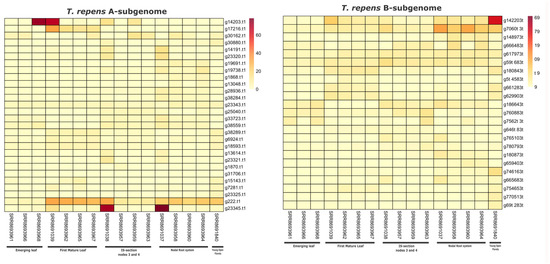 Comparative transcriptomic analysis between subgenomes–A and B of T. repens during five different development stages. Left panel shows the expression of 29 different NLR genes in subgenome-A, whereas right panel shows the expression of 23 NLR genes in subgenome-B of T. repens.